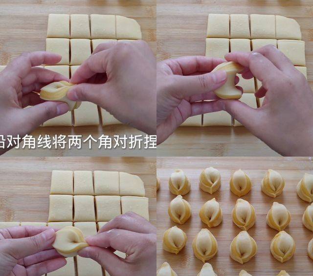 把边沿不规矩的中央切掉,然后把**面片联系成小方块。掏出一个小方块,先沿对角线把此中两个角捏紧,再把别的两个角往下 折,然后捏紧就能够了。全体做好当前,盖上便利袋避免风干 。
